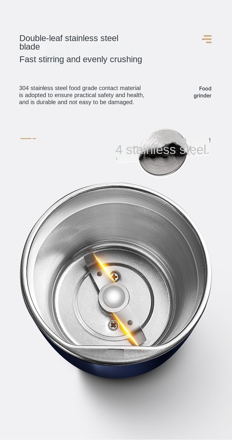 [High Quality Grinder]: The inner wall and blades of the coffee grinder are made of Food Grade stainless steel,strong and durable, the body is made of high quality thickened plastic,lightweight and portable,double stirring blades,motor speed up to 30,000 revolutions per second,Blade runs 360 degrees,super grinding,extremely fine. Effective solution for slow grinding speed and long grinding time.Problems uneven coarseness and fineness.